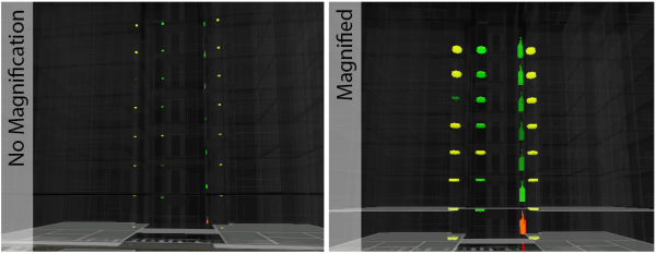 The magnify effect is used to make small objects more visible in vision modes by enlarging them.