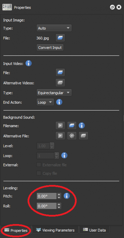 In many instances, the footage or image used for the scene may be tilted or rotated in someway which disrupts the visual level of the scene. You can use the Leveling controls under the Properties tab to adjust these Pitch and Roll of the scene as needed.