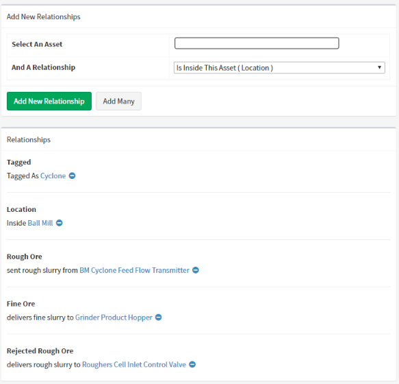 Relationships can be deleted by clicking on the minus symbol () to the right of the name of the related asset.