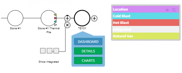 In the image above, we can see that Stove #1 Thermal Pile receives Natural Gas and Cold Blast and outputs Hot Blast. It is also Integrated with another asset.