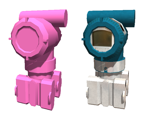 Above is an example - the pink model has no skin, while the blue one is painted as a Yokogawa EJX pressure transmitter. Using a different skin again, it could change to look like it's from a dozen different manufacturers, or could even look like a different device all-together.